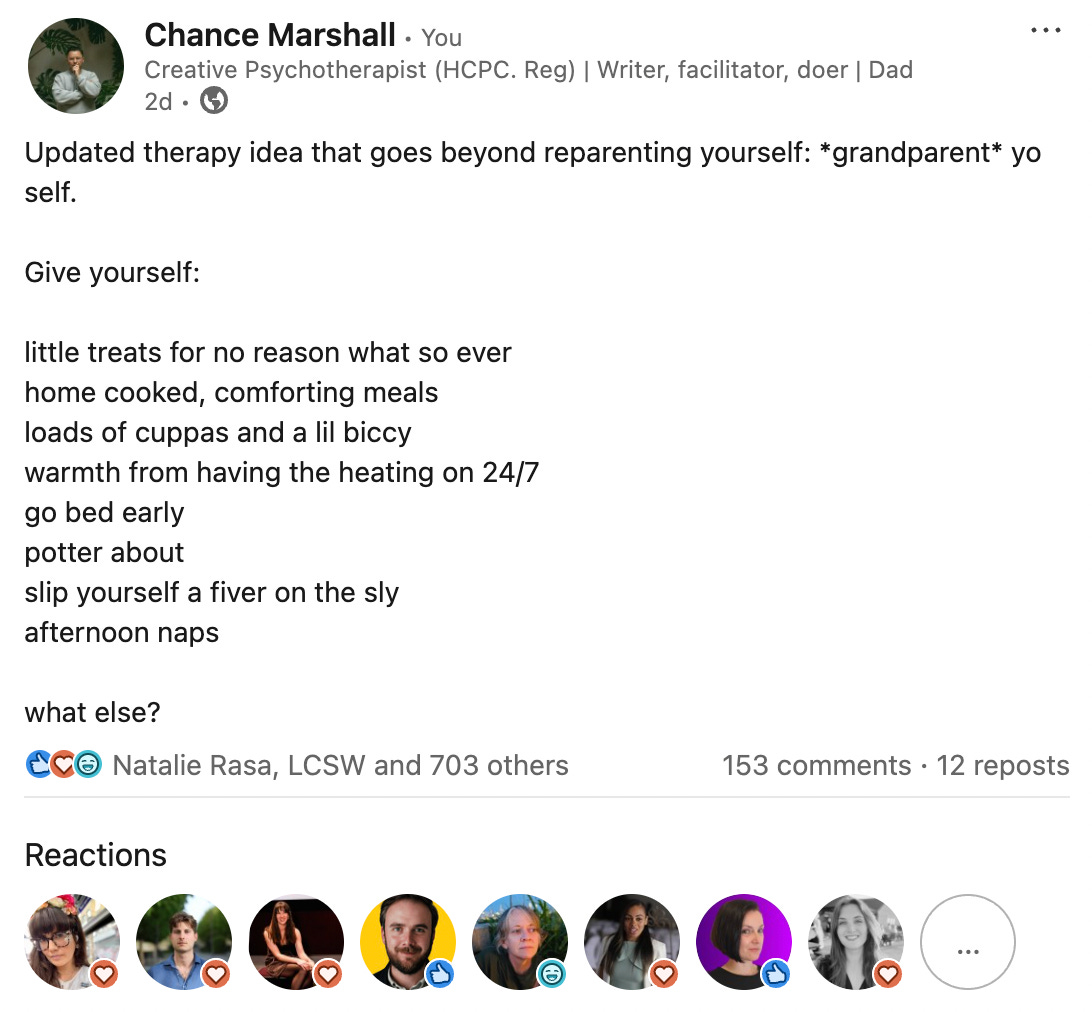 So here it is: the full grandparenting yourself manifesto. From mint imperials to hankies up sleeves, jigsaws with missing pieces to jam donuts eaten on the sly. This is how we learned to be loved. This is how we can love ourselves. All from you. Do these things to grandparent yourself: